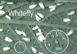 The whitefly can seriously injure host plants by sucking juices from them causing wilting, yellowing, stunting, leaf drop, or even death.